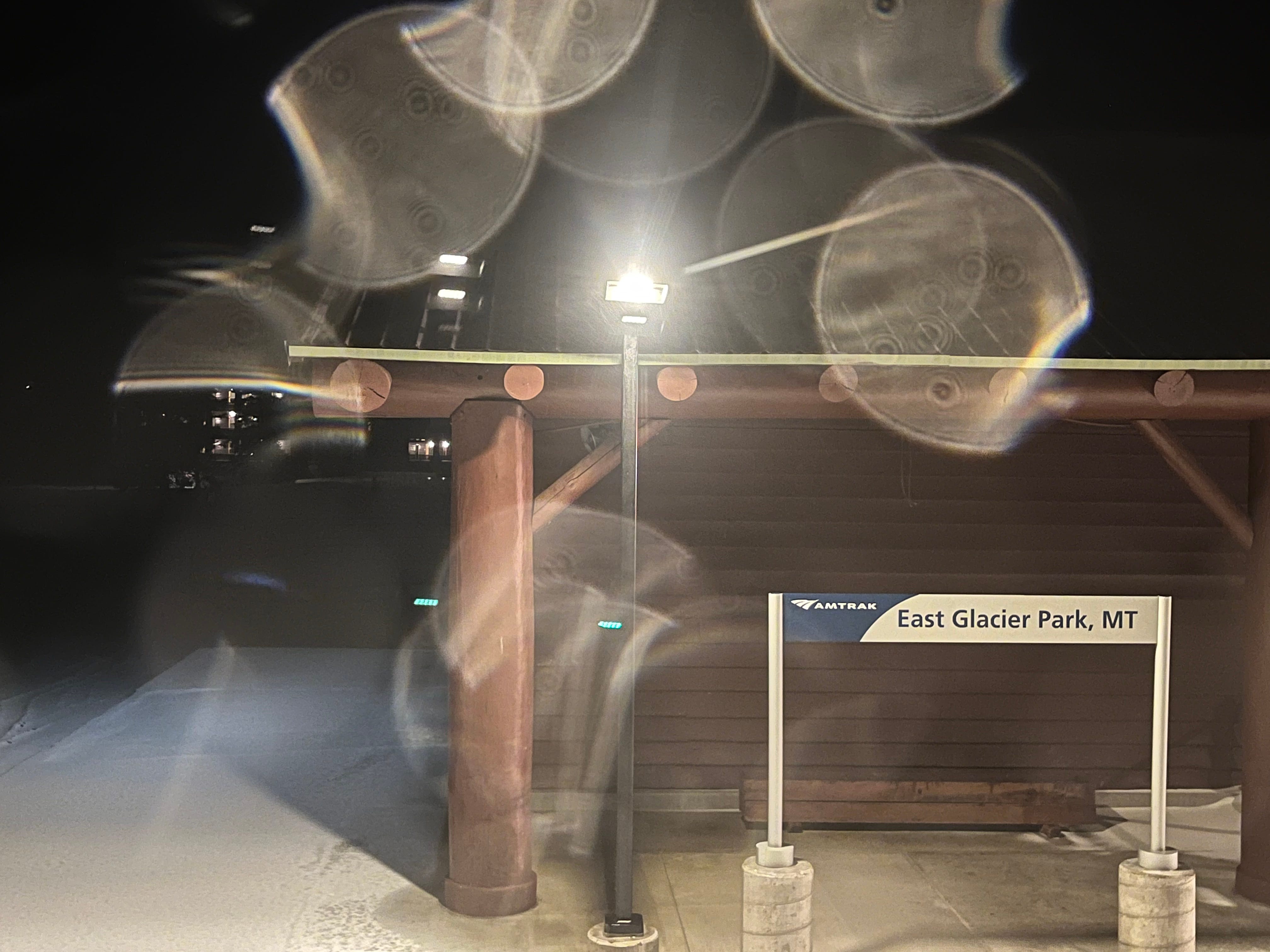 We did not see Glacier in the daylight but were delayed again at the stop for East Glacier, where I hope to return when the stop and the hotel are both open again. But there it was, picked out in the low light of the hotel windows and the low light of the single streetlight at the station. Snow was falling, and I was tangled in Amtrak blankets, and it might have been one of the most romantic moments of my life, some combination of the lantern waste of The Lion, The Witch and the Wardrobe, and the cozy winter of any children’s book about the season, maybe even Emmet Otter’s Jugband Christmas, the favorite that has defined my holidays for decades.