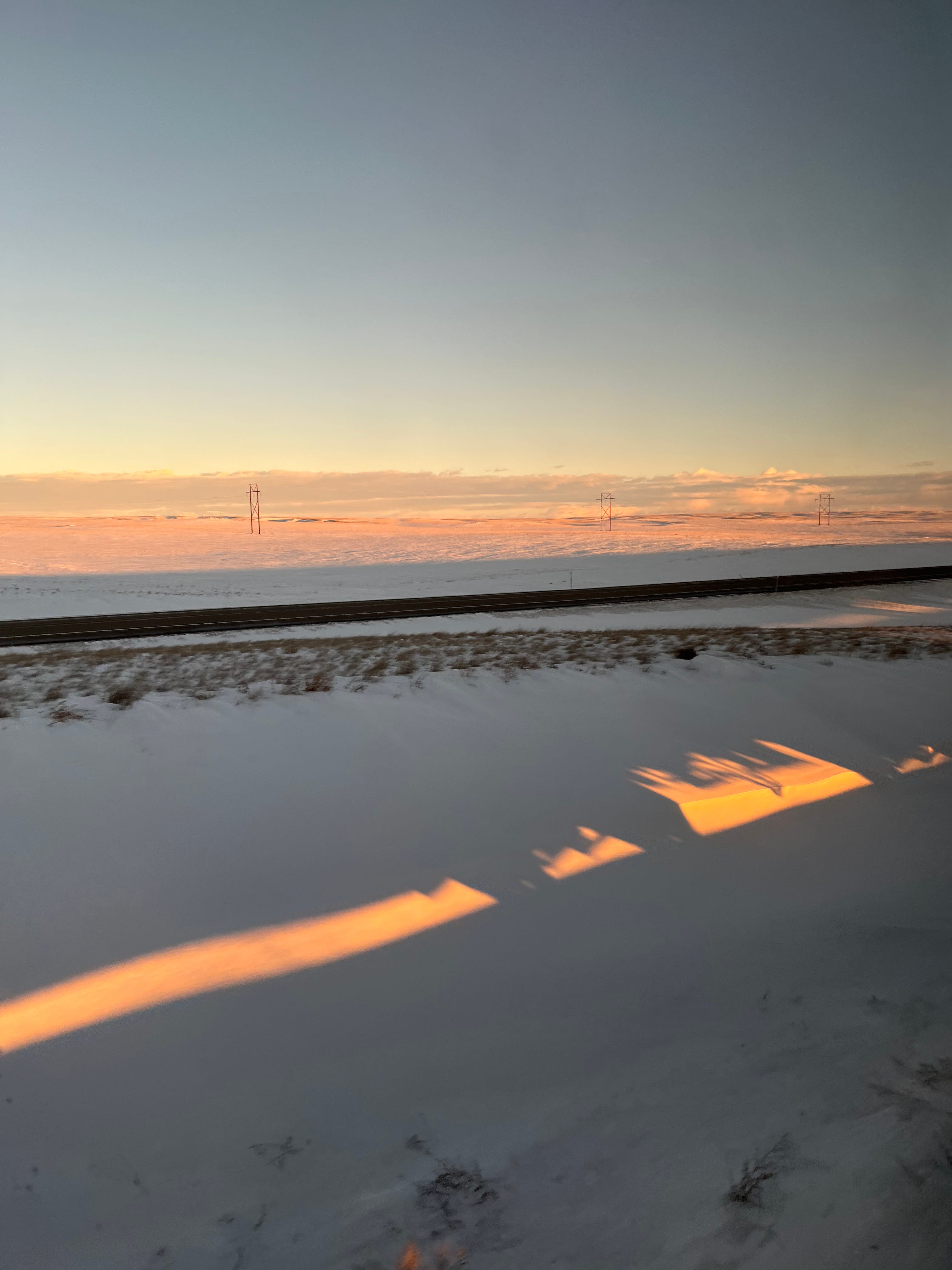 I will remember the delay in the train, of course. But I will also remember that once our sister train arrived, and we were all jolted with the sensation of our trains linking together, we were treated to lunch in the dining car (did you know all food comes free with a roomette?). And then we sat in the observation car again, and we met so many people, strangers, Americans, over food, with the absolutely gob smacking beauty of the winter West rushing past our windows, forests, lakes, snowy pines, mountains, small cities, Indigenous nations, elk, mule deer, the tiny footprints of little animals on a snow-covered prairie.